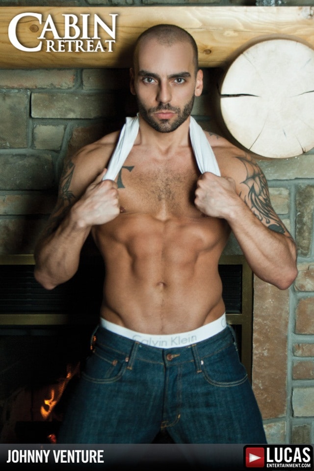 Lucas Entertainments says: Johnny Venture is a showoff that deserves admiration: while vacationing at the log cabin in the woods with the rest of his hot guy pals, he’s showering with the stall partially open. On display are his rugged good looks, six-pack stomach, and fat cock (which is so thick it looks like a beer can). It’s routine that during his early morning showers Johnny jerks off so he can make it out the door with a clear mind, but his session is interrupted this morning when Ben Driver sneaks into the bathroom to take a piss.